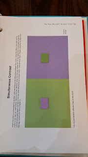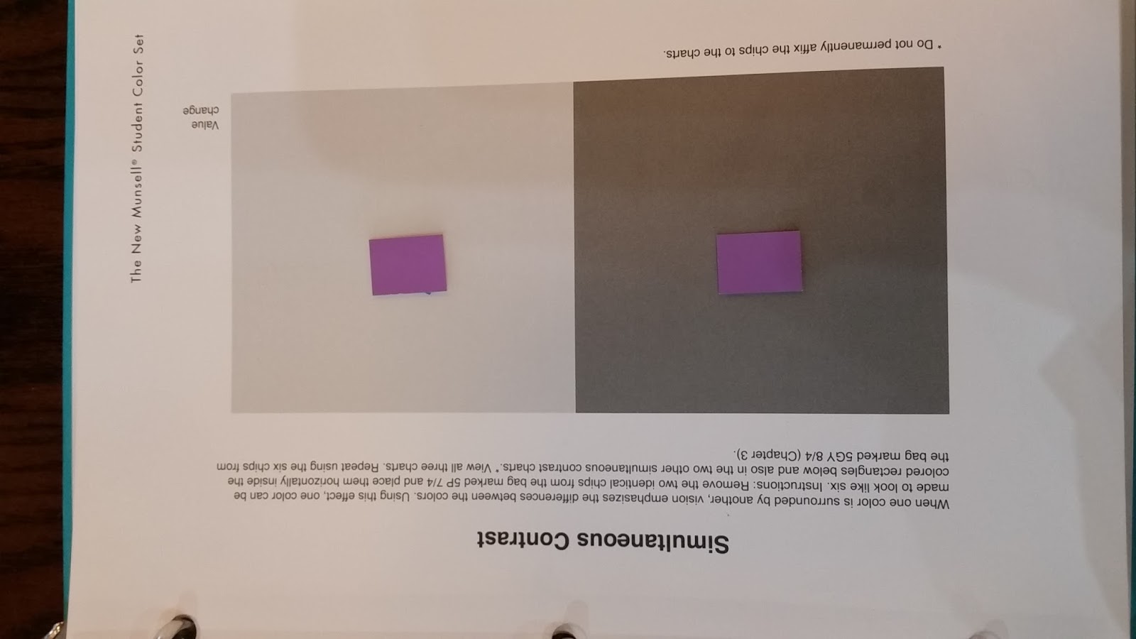 I surrounded one of the violets with a darker violet to make it look duller and blue-ish. I surrounded the other violet with a very dull yellow to complement the violet and make it look vibrant and make it seem to have more value.