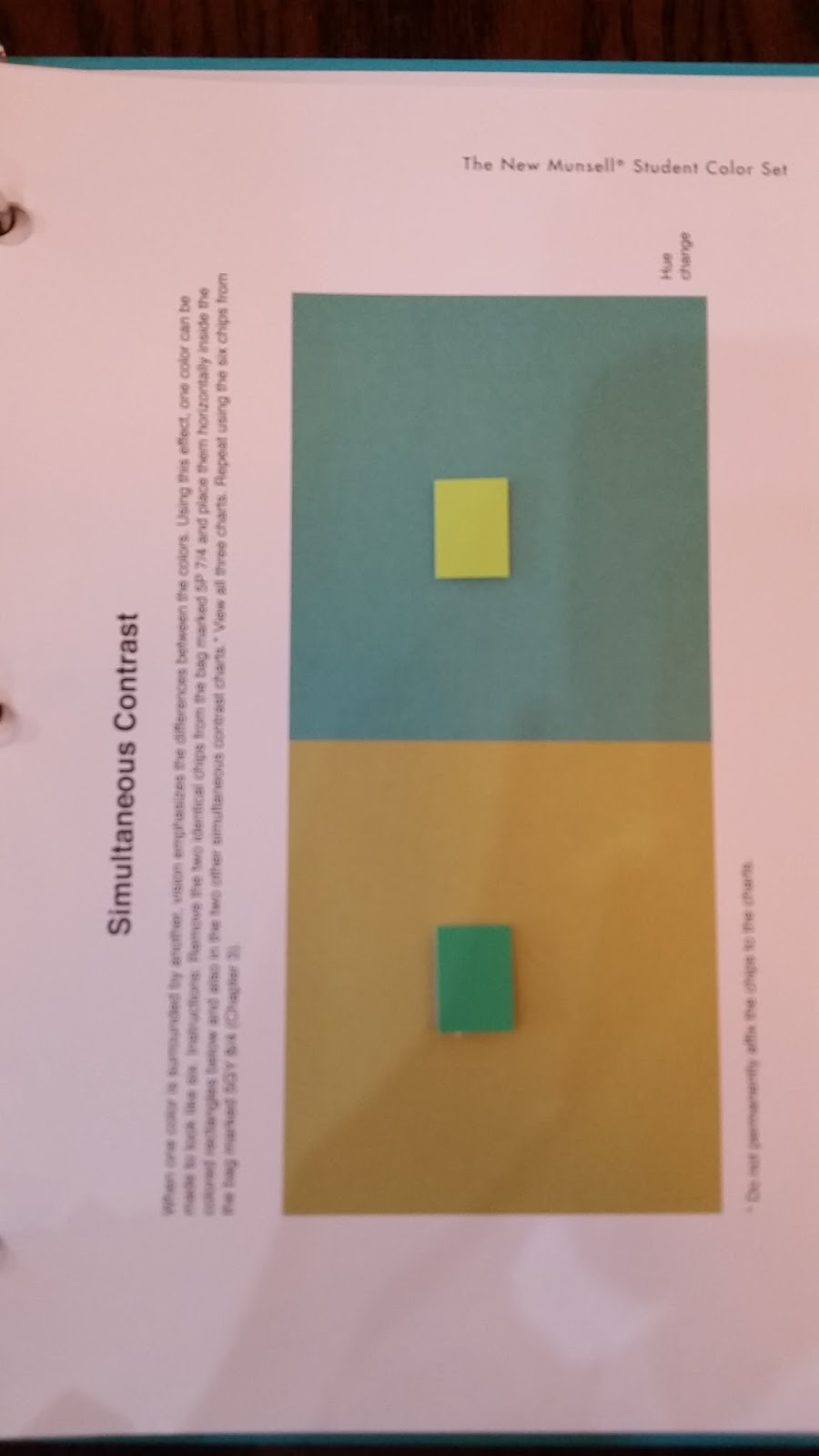 I chose a dull yellow green and a dull yellow orange. For the yellow green I surrounded it by a green of lower chroma to pull some of the green out of the yellow green and make it look more yellow and make it look more vibrant. I surrounded the yellow orange with a vibrant orange of high chroma to dull the yellow and remove some of the orange tint out of the yellow orange.