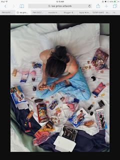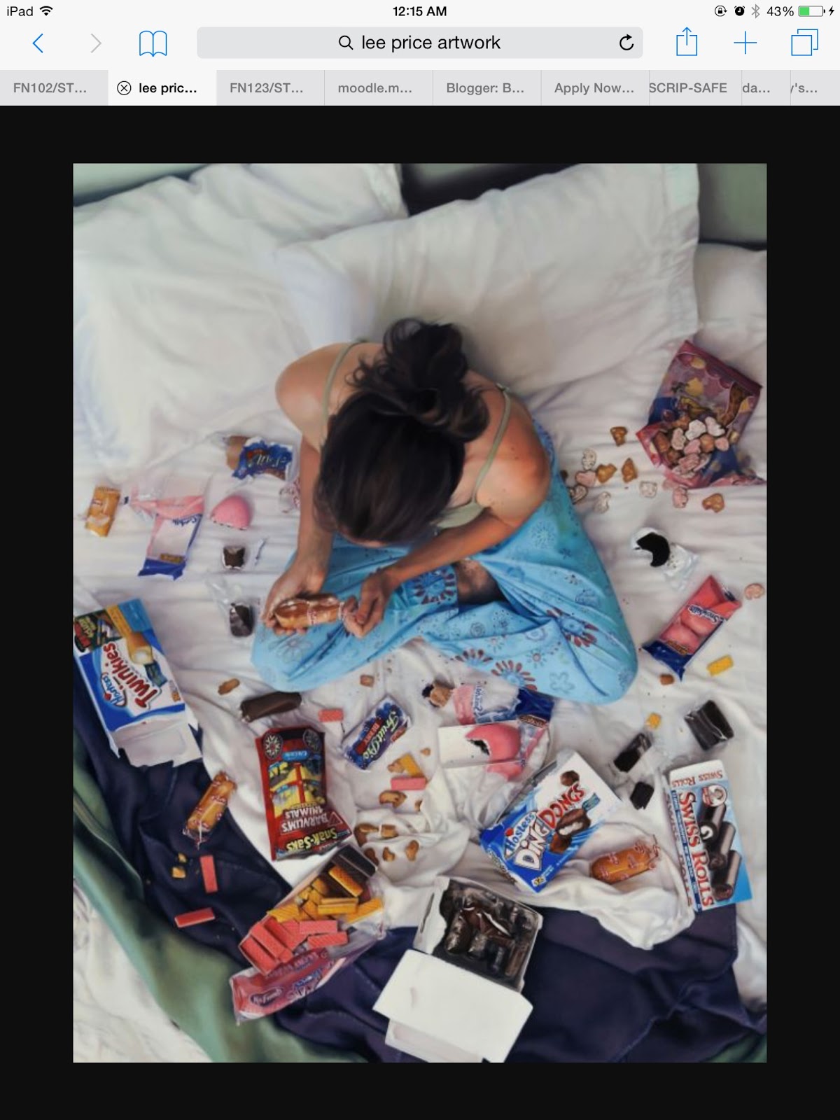 Lee Price is one of my favorite artists, she paints these outstanding works of art that look very photo-realistic but they do not make me feel like I am looking through a lens. She paints all of these different foods and wrappers with these different colors and patterns against a plain bedding which works very well, there is so much to look at and the viewers eye never gets tired. She could have used plain looking foods like chicken or bread but she uses these unhealthy foods with wild wrappers and packaging, to show our relationship with food, and how we eat a lot and do other things that we might be embarrassed about doing but like doing them, in private. I think all of the colors work very well together and the color of the woman's pants are a calm and subtle color, not too distracting even though she is sitting in the middle of the bed.